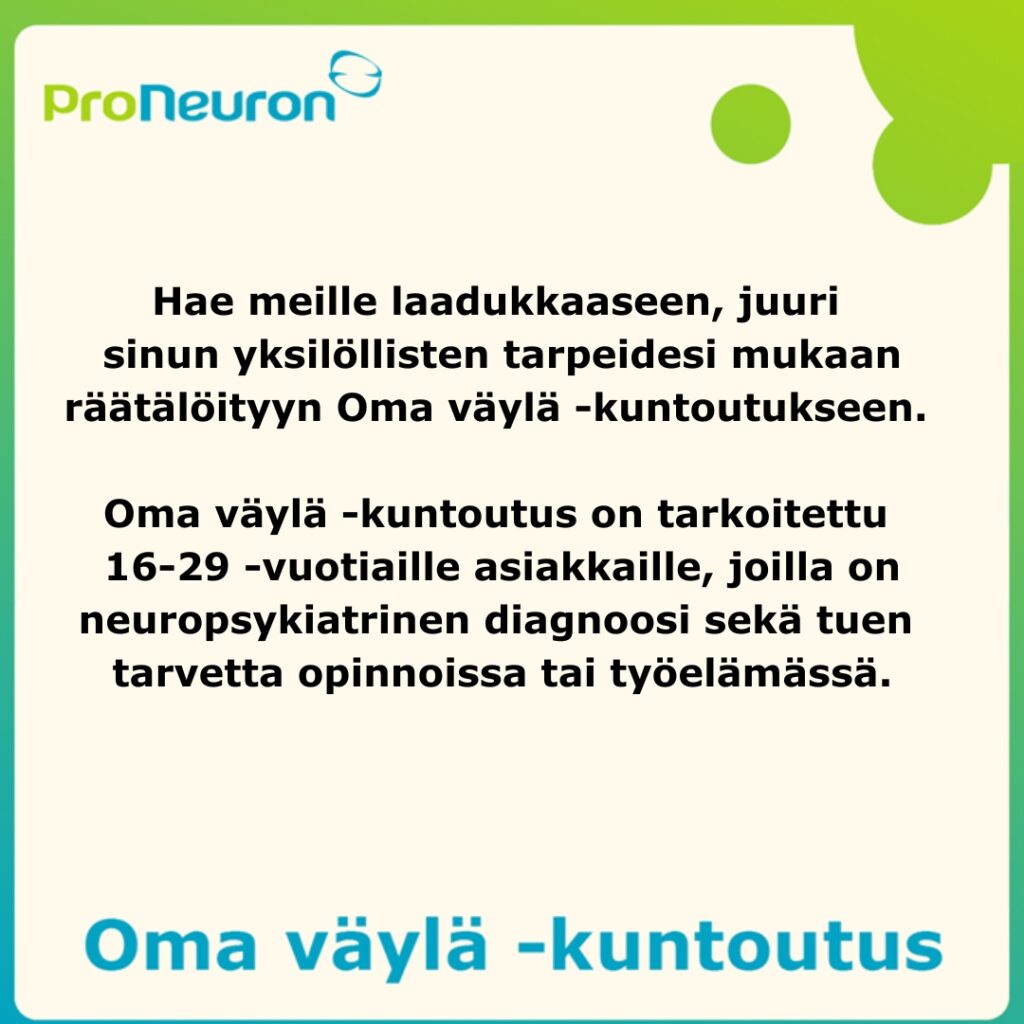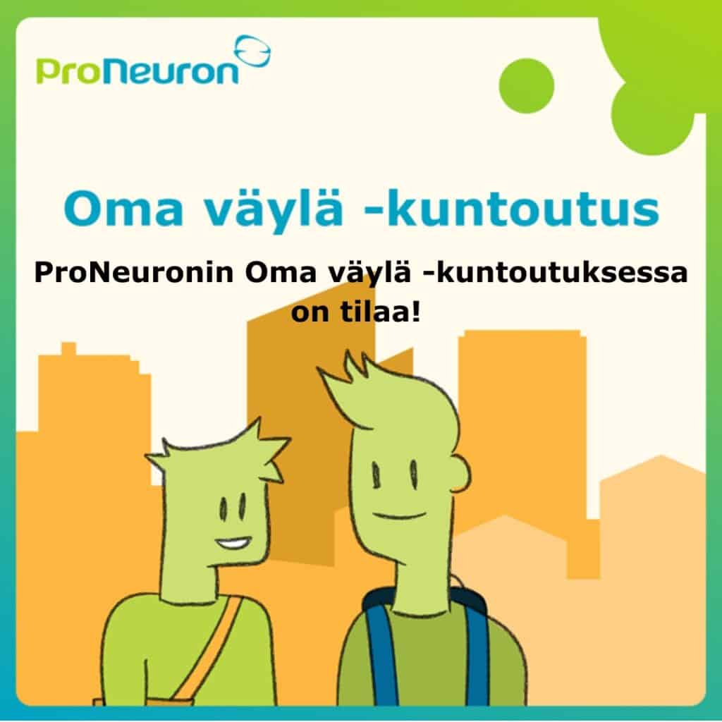 Oma väylä -kuntoutuksessa on tilaa! Julkaistu 18.3.2026 ProNeuronin Oma väylä -kuntoutuksessa on tilaa! Lue lisää tästä.